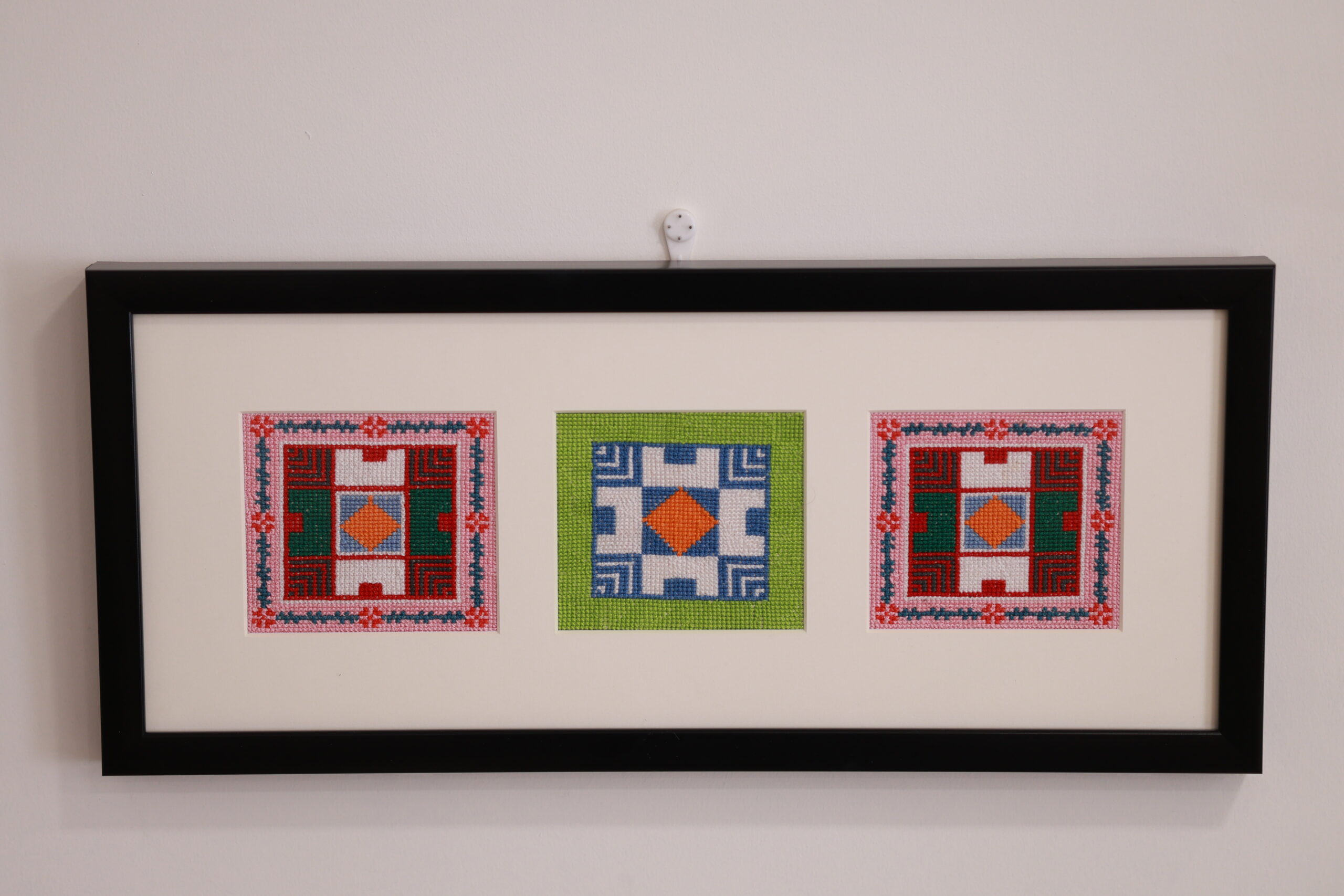 A hand-embroidered piece showcasing three symmetrical traditional Palestinian motifs with intricate geometric design.