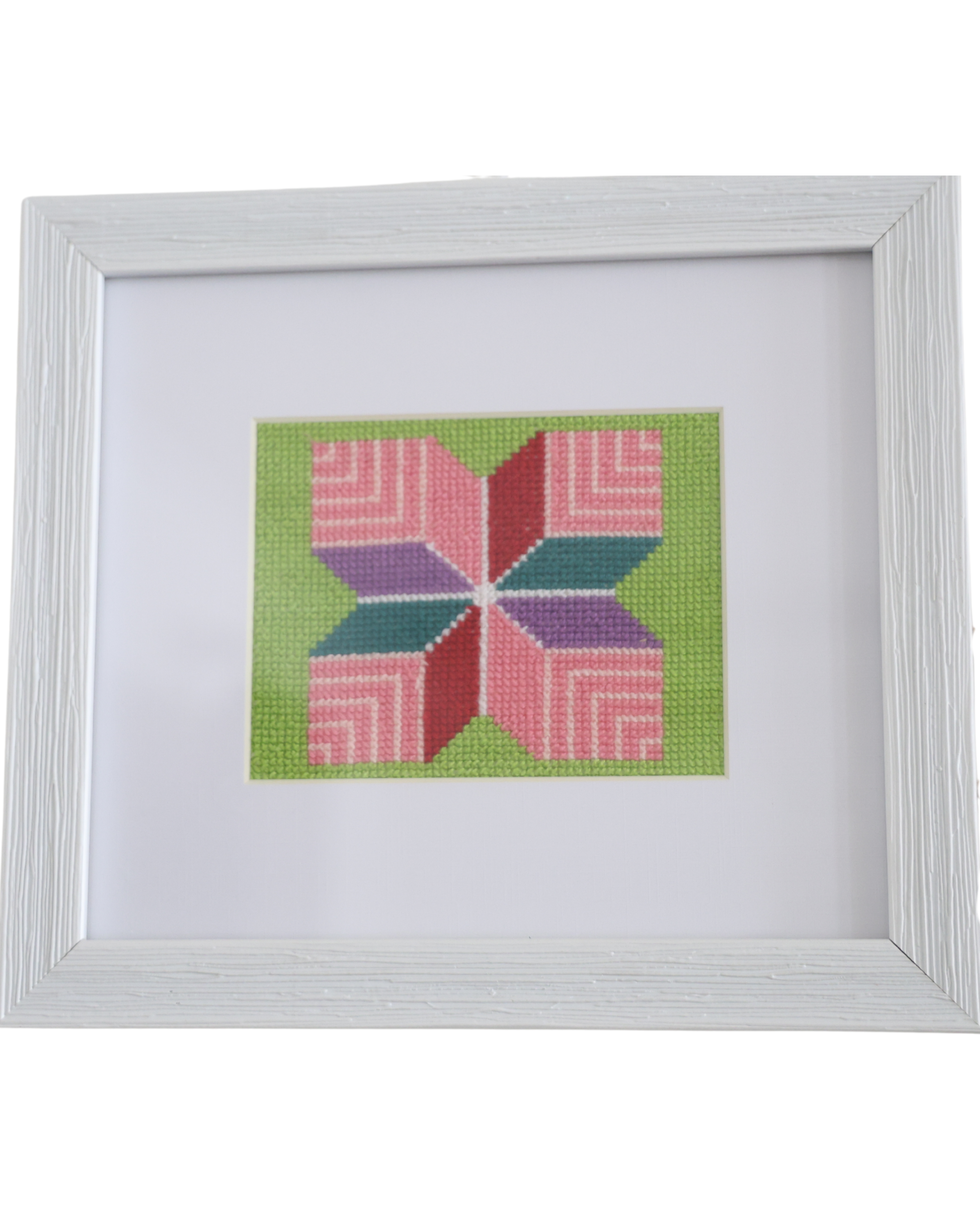 A meticulously hand-embroidered piece inspired by traditional Palestinian ornamental symbols. The geometric design evokes the shape of a flower or star through the harmonious arrangement of colorful petals.