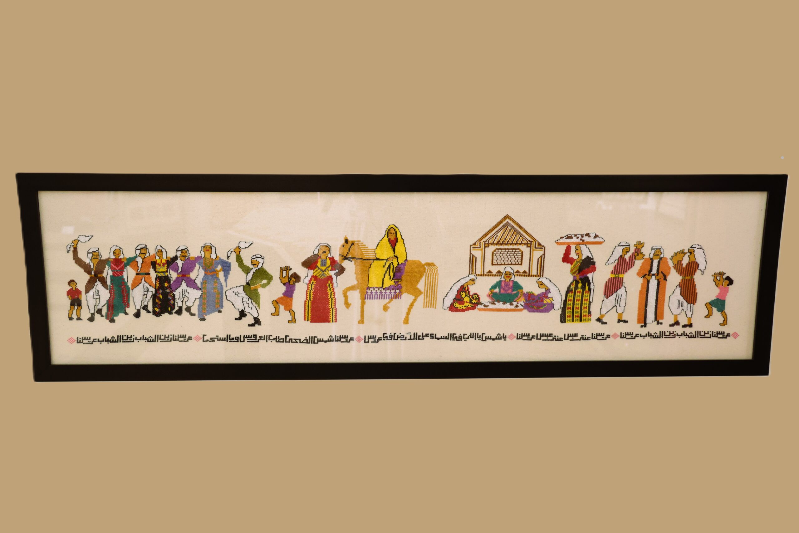 The Palestinian Wedding” portrays a festive scene from Palestinian heritage, where men and women in traditional attire dance and sing in a lively village wedding. The painting expresses joy and hope despite hardship and occupation, symbolizing the Palestinians’ deep connection to their land and culture.